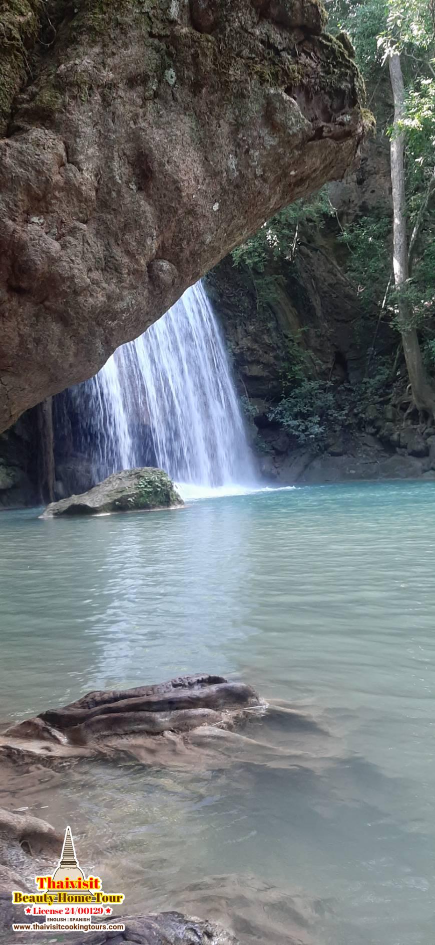 12.00 Erawan Waterfall, formerly known as Sadong Mong Lai Waterfall, is one of the most beautiful and famous waterfalls in the province. There are 7 levels, approximately 1,500 meters (about 4921.26 ft) long, and each level has a different beauty. On the cliff above the 7th level waterfall, when there is a waterfall, it looks like a 3-headed elephant, known as “Erawan Elephant”, hence the name “Erawan National Park”.