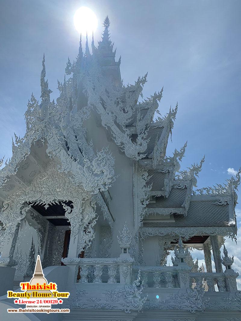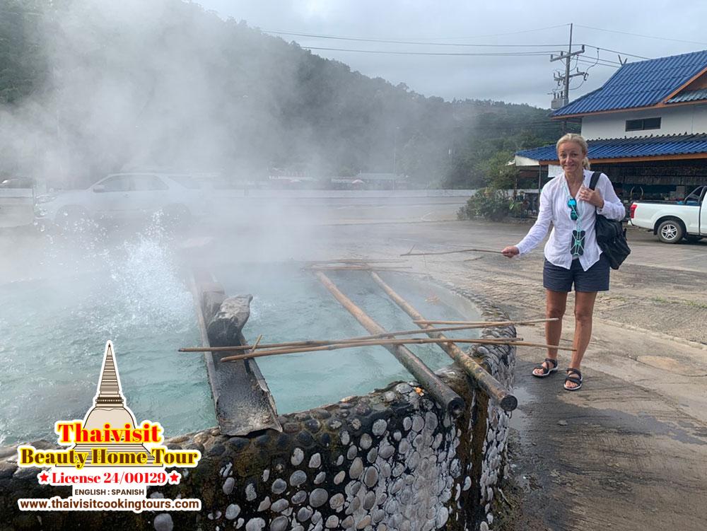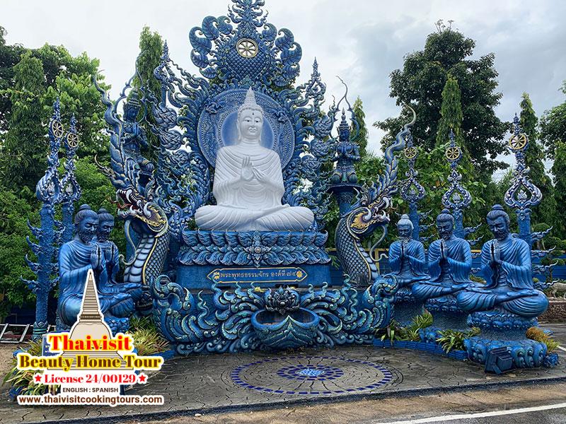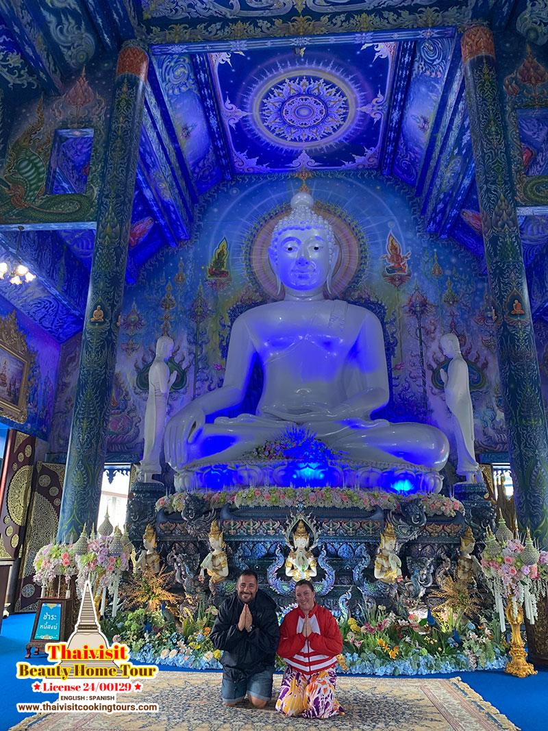 pick up from the hotel in an hour stopping at hot spring in a short visit ,here can take some coffee in your choice or breakfast .Then straight directly to temple wat Rong Khun is called ‘White temple” arriving in 2 hours, you will see the beauty of arts and architectures of this contemporary temple ,white is mean purify following by the Lord Buddha ‘s teaching .Learning the meaning of his hidden valuable in itself ,it is quite a big temple full of the ideas and imaginations of the artist name professor Chalermchai Kositpipat is the creator of this temple ,one of the most interesting place ,can’t miss in the North of Thailand .After this will visit the temple wat Rong Sue Ten is called Wat Fah or blue temple following by his color paint all around means happiness , should have a visit also .His Buddha image in northern Thai Chiang Sean style ,the oldest style in the north of Thailand and his roof painting are impressive with the life of the Buddha