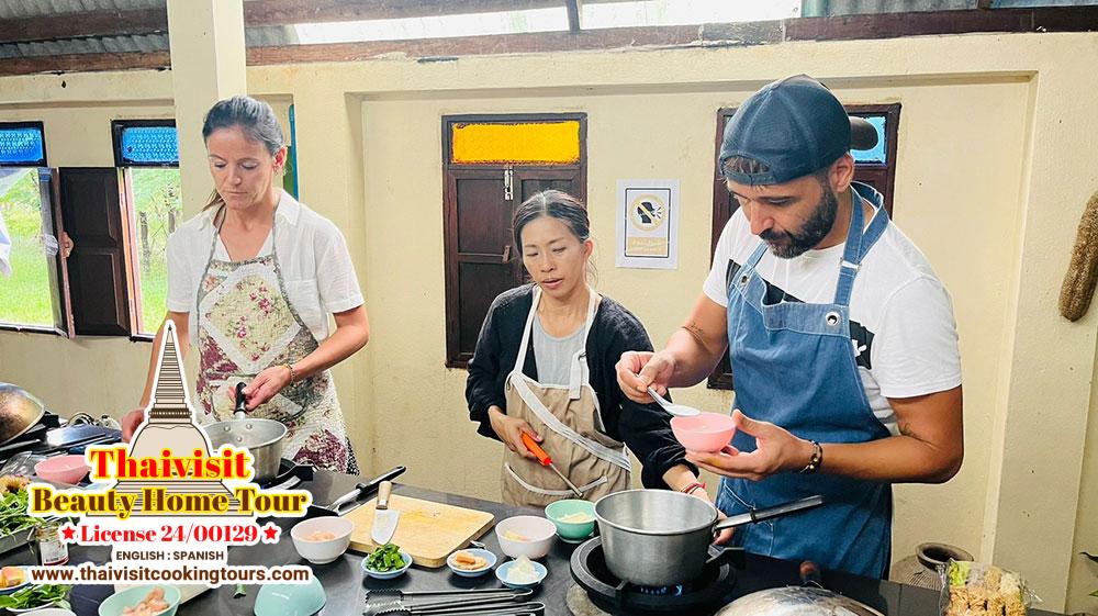 Pick up from the hotel by car or local transport. Visit a local market to buy some ingredients and learn about vegetables and fruits. It is an everyday market. You will get your own station to cook and also learn about herbs and trees in the garden as well. Cook start with a soup ,Padthai, a curry end with a dessert Mango with sticky rice. Making chili paste in a mortar and steam rice. Class will be held by Ann.She loves cooking and can admire to share her technique how to cook and make it in easy way to understand at the end you will forward you an e-book recipe by email or any of ways on your comfortable .You can consult her any time you cook .At home , it is surrounded by natures and local houses , quiet and nice place .You will enjoy your cook and get to know a lot from this class. We guarantee that you will have a good memory of this beautiful half day. Please let us know about you’re interested in the class.