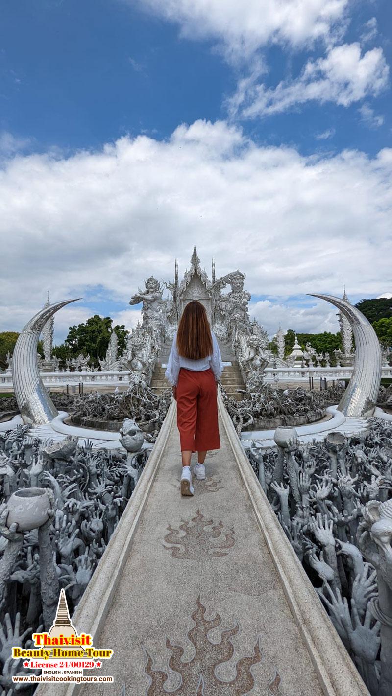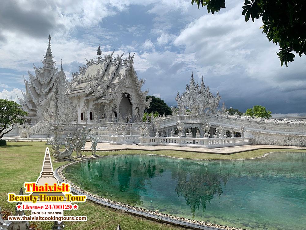 Start at 7.00-20.00 : pick up from the hotel in an hour stopping at hot spring in a short visit ,here can take some coffee in your choice or boiled eggs from the hot spring .Then straight directly to temple wat Rongkhun is called ‘White temple” arriving in 2 hours, you will see the beauty of arts and architectures of this contemporary temple ,white is mean purify following by the Lord Buddha ‘s teaching .Learning the meaning of his hidden valuable in itself ,it is quite a big temple full of the ideas and imaginations of the artist name professor Chalermchai Kositpipat is the creator of this temple ,one of the most interesting place ,can’t miss in the North of Thailand .After this will visit the temple wat Rong Sue Ten is called Wat Fah or blue temple following by his color paint all around means happiness , should have a visit also .His Buddha image in northern Thai Chiangsean style ,the oldest style in the north of Thailand and his roof painting are impressive with the life of the Buddha