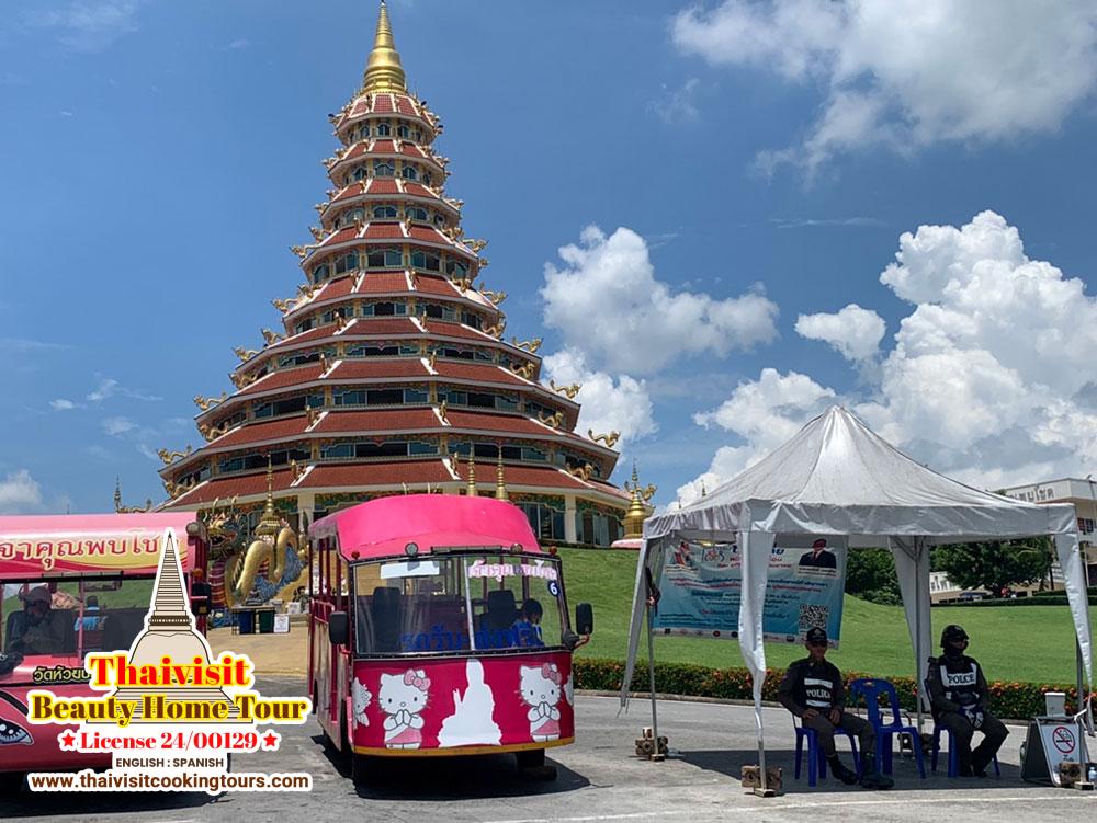 From here we will visit the black house. It takes about 15 mi. From blue temple contains almost 40 houses in different style created by the artist called professor Thawan Duchanee ,his works are the oldest of art among them all visit today, and collected from many places around the world shown our life of Thai northern style included along the Mighty Maekhong river ‘s life .If you would like to learn more things our tour guide can help to explain more. Finally, we will visit a vegetarian temple called wat Huayplakang with her statue of a woman monk named Guan Yim and statues of Dragones decorate along the staircase. So, make sure that it is a day you have with many beautiful pictures to remember. At about 16.00 we will start to leave back to Chiangmai and arriving time is about 20.00 p.m. On the way to Chiangrai passing small mountainous,villages,rice fields, good road and valuable trip. Please contact us for more information.
